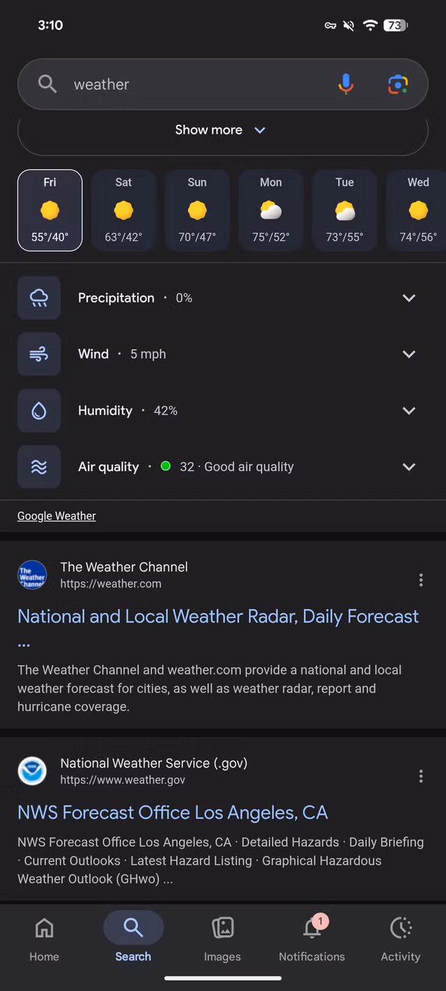 Ứng dụng Google từ lâu đã cung cấp trải nghiệm “Thời tiết” toàn màn hình, có thể truy cập từ lối tắt trên màn hình chính: biểu tượng mặt trời và mây kèm theo logo ‘G’.