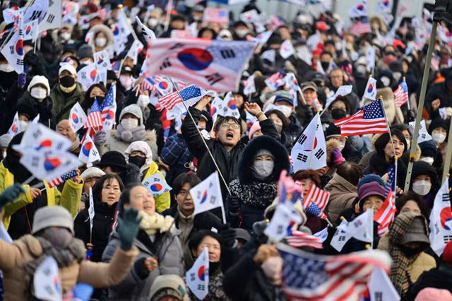 Đám đông người biểu tình phản đối lệnh bắt giữ ông Yoon (ảnh: Korea Times)
