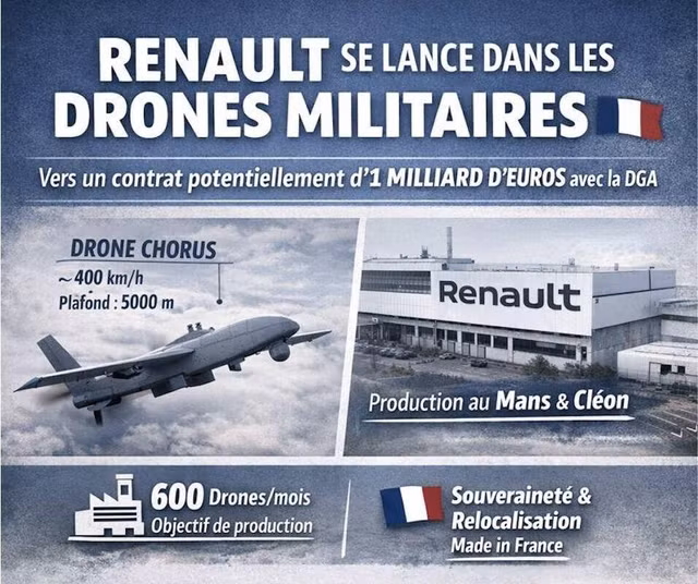 "Chúng tôi đã được Bộ Lực lượng Vũ trang Pháp liên lạc vài tháng trước về một dự án phát triển ngành công nghiệp máy bay không người lái của Pháp", Fabrice Cambolive, giám đốc tăng trưởng của Renault, cho biết trong một cuộc phỏng vấn trên BFM TV hôm thứ Ba. "Chúng tôi đã được liên hệ với chuyên môn về công nghiệp, sản xuất và thiết kế của chúng tôi. Dự án này hiện đang được tiến hành".