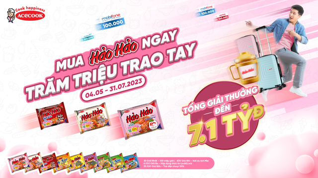 Vẫn còn đến 15 giải nhất, 428 giải nhì, 4.725 giải ba đang chờ bạn! Chương trình khuyến mãi mùa hè “Mua Hảo Hảo ngay - Trăm triệu trao tay” được áp dụng cho 9 loại sản phẩm Mì ăn liền Hảo Hảo bao gồm: Hảo Hảo hương vị mì tôm chua cay, mì Hảo Hảo hương vị sườn heo tỏi phi, Hảo Hảo mì xào hương vị tôm hành, Hảo Hảo hương vị mì gà vàng, mì Hảo Hảo hương vị sa tế hành tím, Hảo Hảo mì xào hương vị tôm xào chua ngọt, Hảo Hảo mì chay hương vị rau nấm, Mì Hảo Hảo hương vị lẩu kim chi hàn quốc, Hảo Hảo mì xào hương vị hải sản đậm vị Việt.