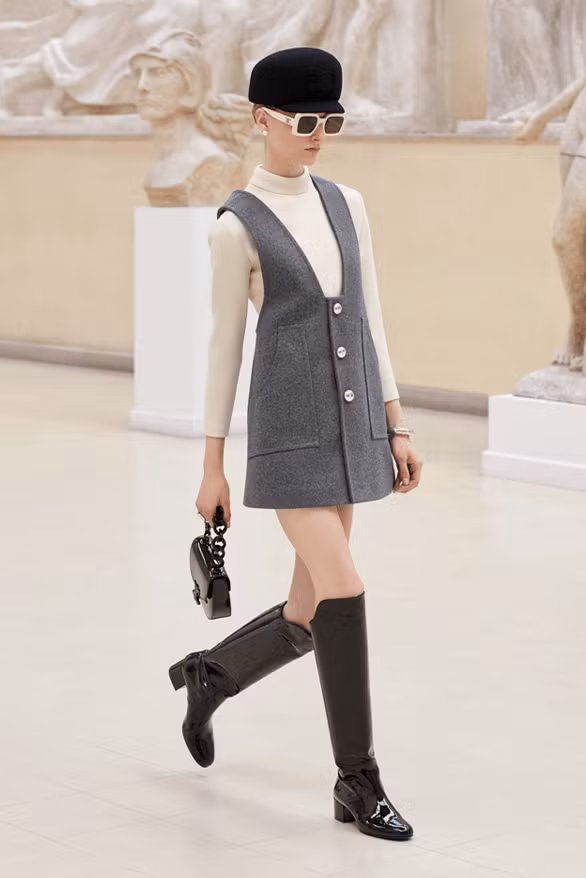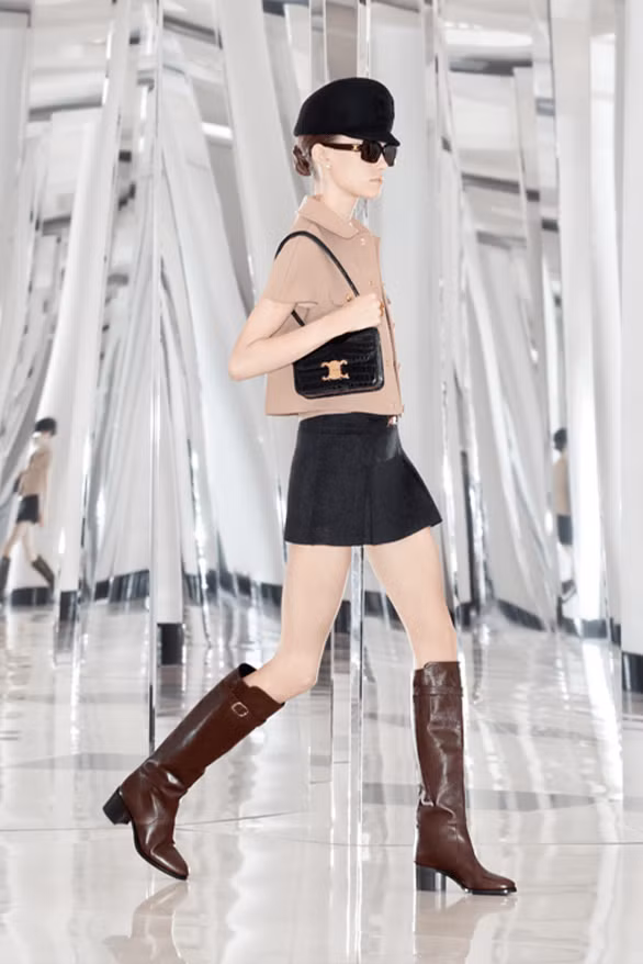 Trong khi dòng nước hoa cao cấp của thương hiệu thể hiện bản sắc của CELINE thông qua các nốt hương khứu giác, thì các người mẫu bước ra hành lang phản chiếu với màu son môi “La Peau Nue”, ra mắt bộ sưu tập “LE ROUGE CELINE” hoàn chỉnh với 15 sắc thái. Dòng trang phục dành cho nữ mang lại cảm giác đắc thắng, phản ánh di sản của CELINE thông qua những bộ đồng phục tinh tế. Chiếc váy đen nhỏ kết hợp với phần vai có cấu trúc và phụ kiện ngọc trai, làm nổi bật buổi trưng bày với những bộ đồ phối ca rô kiểu Paris kết hợp phong cách nam tính và nữ tính. Những dải ruy băng phóng đại và đồ trang trí bằng da thu nhỏ tự tin bước đi, lung linh trên sàn diễn với các điểm nhấn kim loại tỏa sáng dưới ánh đèn sân khấu.