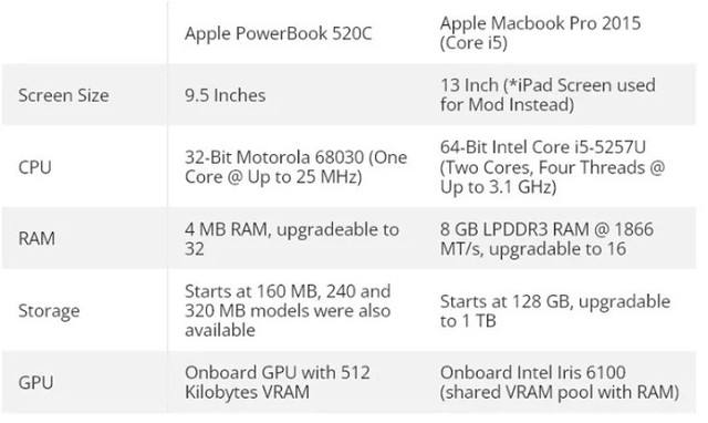 Dựa vào bảng thông số kỹ thuật cho thấy, những cải tiến của MacBook Pro 2015 là rất rõ ràng và gần như khó có thể so sánh với phiên bản đầu tiên. Lý do để Billy The Kid lựa chọn PowerBook 520C là vì khi sản phẩm ra mắt, nó là một trong những thiết bị rất sáng tạo. Vào thời điểm đó, một số yếu tố đã biến chiếc máy tính này thành máy tính của tương lai, chẳng hạn như bàn di chuột hoặc thậm chí là hỗ trợ pin kép giúp máy có tuổi thọ cao hơn.