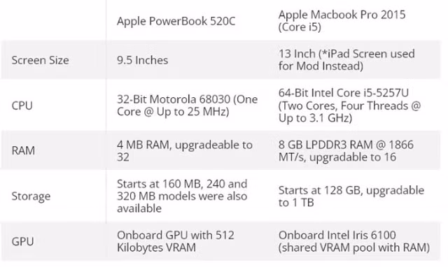 Nhằm giúp người dùng có cái nhìn so sánh về sự khác biệt của hai chiếc máy tính, chúng ta hãy nhìn vào bảng thông số kỹ thuật giữa chúng xem khác nhau như thế nào. Đó là bảng so sánh thông số giữa PowerBook 520C x MacBook Pro 2015.