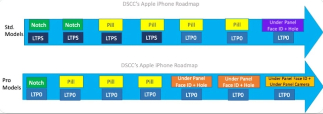 Trước năm 2025, các mẫu iPhone tiêu chuẩn sẽ vẫn có Dynamic Island và tốc độ làm mới 60Hz. Sau năm 2025, các mẫu iPhone tiêu chuẩn sẽ giữ Dynamic Island nhưng sẽ có tốc độ làm mới 120Hz. Điều này sẽ lặp lại với các mẫu iPhone 18 2026. Tới năm 2027, iPhone 19 và iPhone 19 Plus sẽ được loại bỏ Dynamic Island, thêm Face ID dưới màn hình và đi kèm chi tiết “đục lỗ” ở mặt trước.
