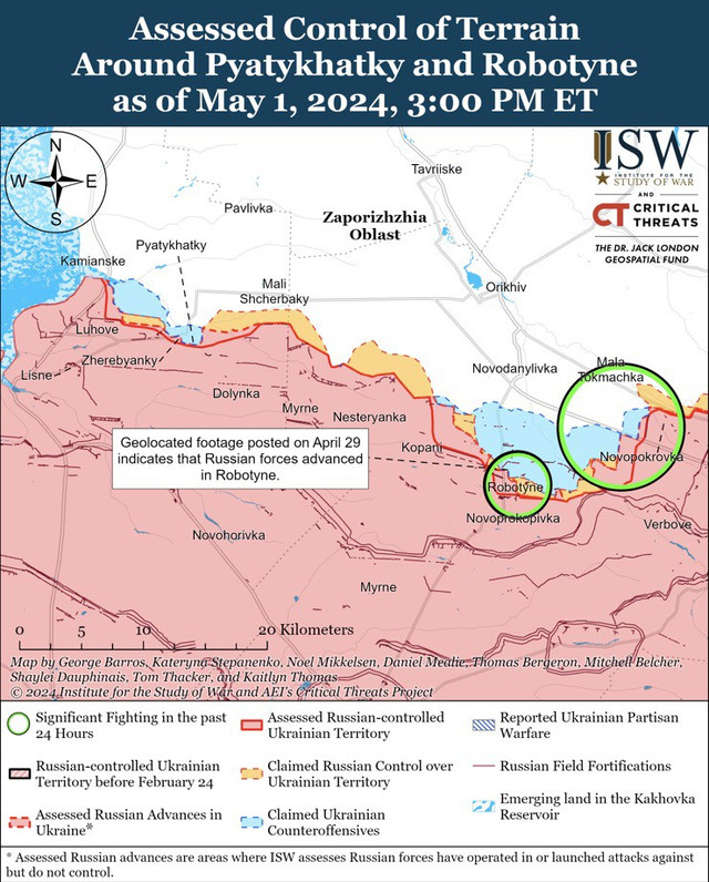 Theo ISW, tính đến ngày 1/5, quân đội Nga gần như kiểm soát hoàn toàn làng Robotyne ở vùng Zaporizhzhia. Robotyne là ngôi làng mang tính biểu tượng mà Ukraine giành lại trong cuộc phản công vào mùa hè năm ngoái.