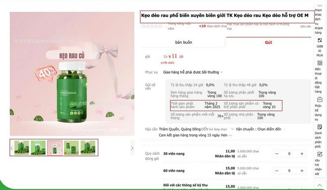 Cụ thể, hình ảnh cho thấy trên nền tảng 1688, hộp 30 viên kẹo rau được giao bán với giá 11 tệ (tương đương 38 nghìn đồng, giá áp dụng với khách đặt từ 100 hộp và chưa tính phí vận chuyển). Theo thông tin từ nhà sản xuất, đơn vị này cũng hỗ trợ hình thức OEM, tức là gắn thương hiệu được khách hàng yêu cầu.