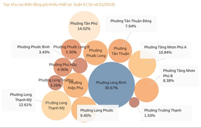 Khu vực tăng cao nhất là phường Long Bình, với mức tăng khoảng 30,6%, phường Tân Phú tăng 15%, phường Tăng Nhơn Phú A tăng 11%... Trong khi đó các tuyến đường có biên độ tăng rộng nhất là Lã Xuân Oai từ 35 triệu đồng/m2 tăng lên 42 triệu đồng/m2, Xa lộ Hà Nội từ 41 lên 55 triệu đồng/m2, đường Võ Văn Hát từ 37 lên 41 triệu đồng/m2…