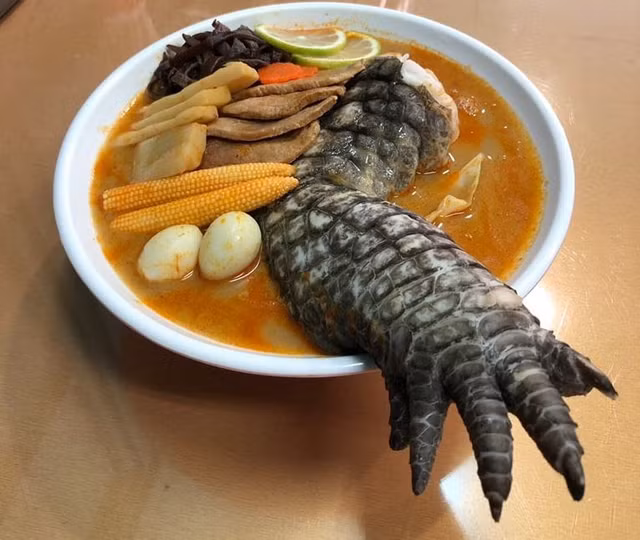 Món ăn này được cho làm từ 40 loại gia vị khác nhau nhưng thành phần chính nhô ra khỏi bát theo đúng nghĩa đen là chân cá sấu om.