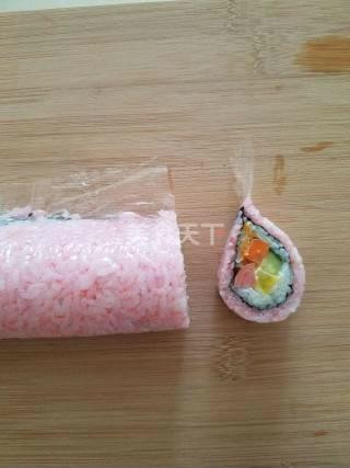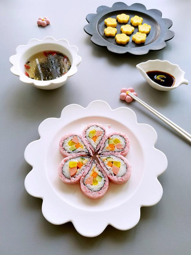 Xếp sushi hoa anh đào ra đĩa, dùng kèm nước tương rất ngon.