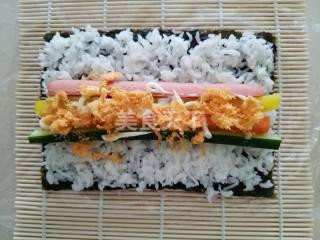 Lật ụp lại để phần cơm xuống dưới phần rong biển trên đầu. Sau đó trải tiếp 1 lớp cơm trắng lên, rồi trộn trải thịt nguội, củ cải, cà rốt cuối cùng rắc ruốc lên trên.