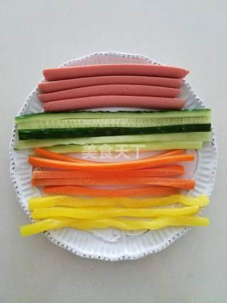 Cắt dưa chuột, củ cải, cà rốt, thịt nguội có kích cỡ bằng nhau. Thành phần nhân của sushi có thể thay đổi tuỳ theo sở thích của bạn.