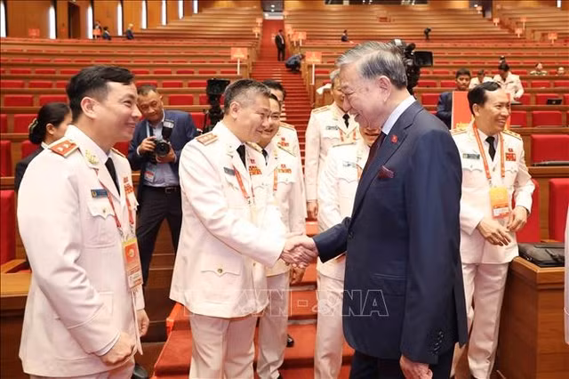 Tổng Bí thư Tô Lâm với các đại biểu Đoàn Đảng bộ Công an Trung ương dự Đại hội. Ảnh: TTXVN
