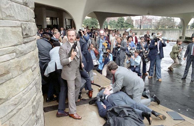 Thư ký báo chí Nhà Trắng James Brady và một sĩ quan cảnh sát bị thương, nằm trên mặt đất sau khi tay súng John Hinckley Jr. bắn sáu phát đạn về phía Tổng thống Ronald Reagan bên ngoài khách sạn Washington Hilton ở Washington ngày 30/3/1981. (Ảnh: Reagan Library)