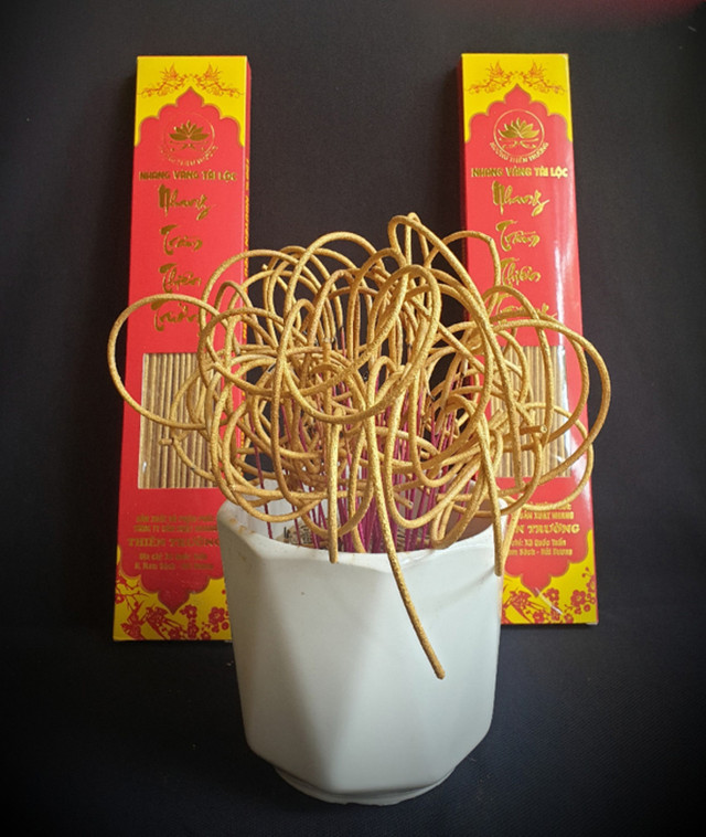 “Khách hàng đặt mua rất nhiều, mới mở bán được khoảng 1 tháng nay tôi đã bán được khoảng vài chục thùng. Loại nhang này đặc biệt là khi cháy xong, tàn của nó tạo thành vòng tròn như đồng xu rất đẹp và mang ý nghĩa rước tài lộc vào nhà. Chúng có mùi thơm nhẹ, thoang thoảng”, chị nói.