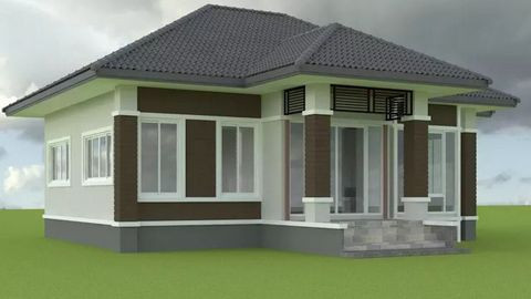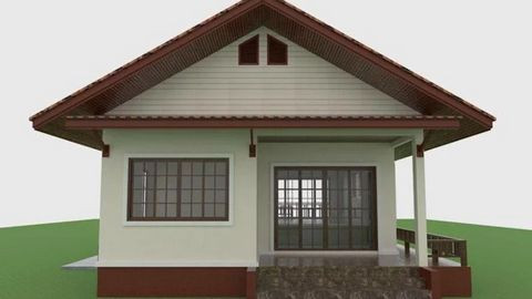 Một thiết kế nhà đẹp cấp 4 nhỏ gọn đa năng, phù hợp với mọi túi tiền của gia chủ. Thiết kế hiện đại pha lẫn nét cổ điển lãng mạn qua chi tiết trang trí cột, tường. Mái nhà dốc có bít đốc và rãnh (Hips and Valley roof) lợp ngói xanh hài hòa với thiết kế mặt tiền. Mặc dù mặt tiền mang lại cảm giác rất nhỏ nhắn, thực ra không gian nội thất khá rộng rãi với 3 phòng ngủ, 2 phòng tắm cùng bếp và phòng khách kết nối với tiền sảnh bên ngoài.