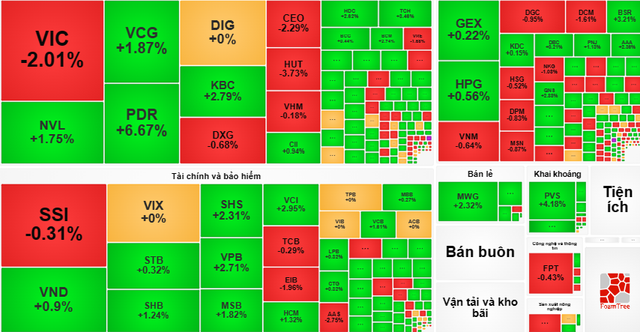Sang phiên chiều, lực cầu mạnh khiến Vn-Index sớm lấy lại đà tăng. Sắc xanh mạnh trong ngày hôm nay chủ yếu đến từ một vài cổ phiếu riêng lẻ, điển hình như PDR (+6.67%), LDG (+4.86%) hay TCH (+3.46%). Bộ ba "họ Vingroup" VIC - VHM - VRE cùng ghi nhận sắc đỏ, theo đó, VIC giảm tới 2,01%, VHM giảm 0,18% và VRE giảm 1,68%. T