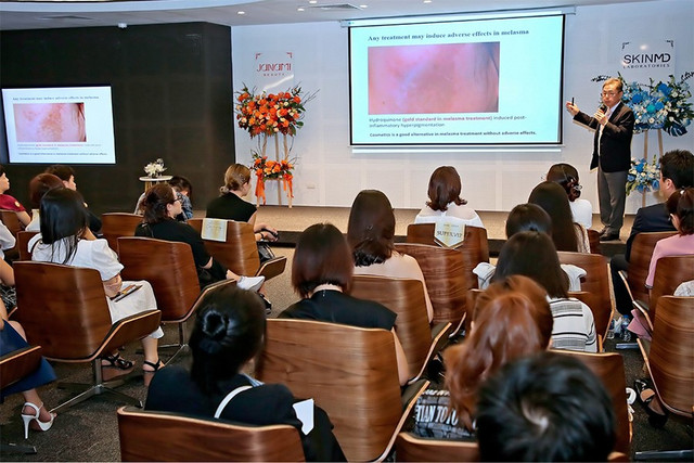 Tại hội thảo, Gs.Bs Park Kyoung Chan đã chia sẻ về những cập nhật nghiên cứu khoa học mới nhất trong trị liệu nám & lão hóa. Đây là nội dung thiết thực giúp tạo nên lợi thế cạnh tranh vượt trội cho các phòng khám, TMV khi nắm được những giải pháp trị liệu được giới y khoa quốc tế công nhận, cùng cách thức áp dụng các phác đồ bôi thoa chuẩn y khoa khi kết hợp công nghệ cao.