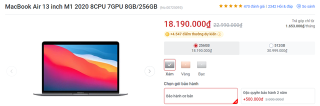 Sản phẩm được giảm giá nhiều nhất trong tháng này là MacBook Air 13 inch M1 2020 RAM 16GB/ SSD 512GB, giảm tới 6 triệu đồng. Các mẫu MacBook khác cũng đang được giảm giá nhẹ.