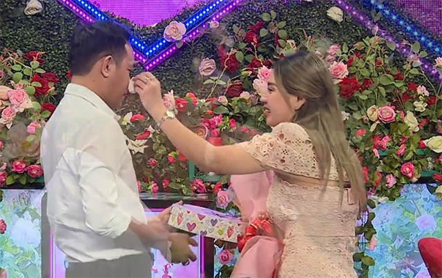 Mở rào gặp gỡ, Nguyễn Sinh chủ động tiến đến tặng bạn gái một bó hoa, lúc này, mắt anh còn đỏ hoe khiến đối phương cũng nghẹn ngào lau nước mắt cho anh.