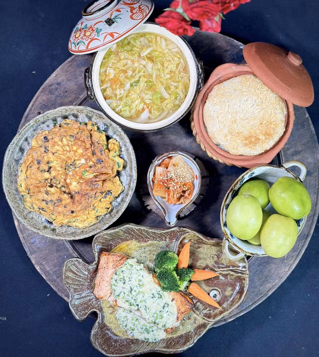 Bắp cải nhồi thịt, trứng rán bắp cải, rau muống xào, cơm bột chùm ngây, mận, củ cải ngâm mắm đường.