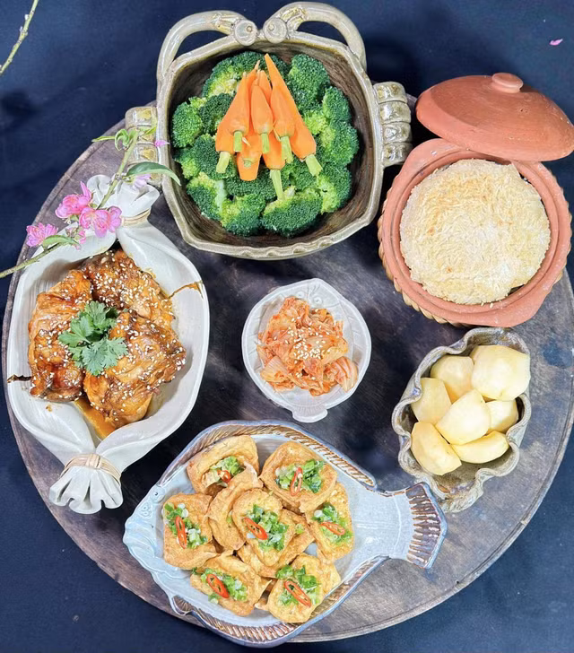 Mâm cơm với những món ăn được chị bày biện đẹp mắt.