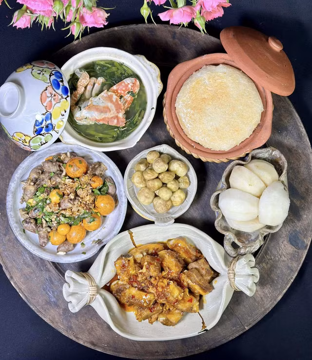 Tim trứng gà rim, sườn xào chua ngọt, ghẹ nấu canh muống, lê, cà muối.