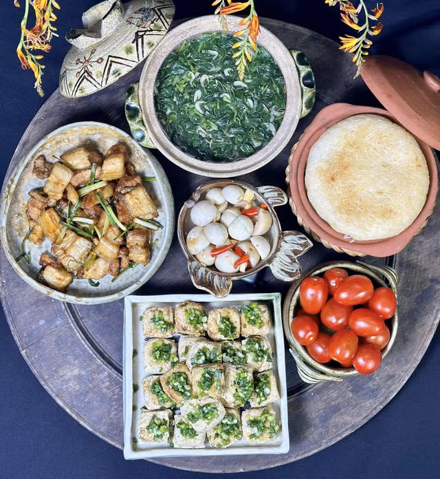Đậu tẩm hành, ba chỉ rang cháy cạnh, rau dền nấu canh moi khô, cà chua bi tráng miệng.