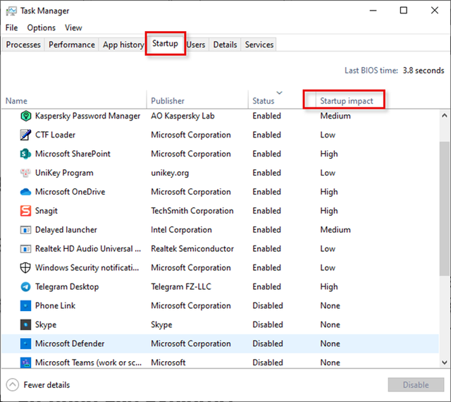 - Bạn có thể xem trạng thái cột “Startup Impact” của từng ứng dụng, để đánh giá mức độ ảnh hưởng của chúng đến tốc độ khởi động. Các mức độ này gồm Not measured (không có tác động), Low (thấp), Medium (trung bình) và High (cao).