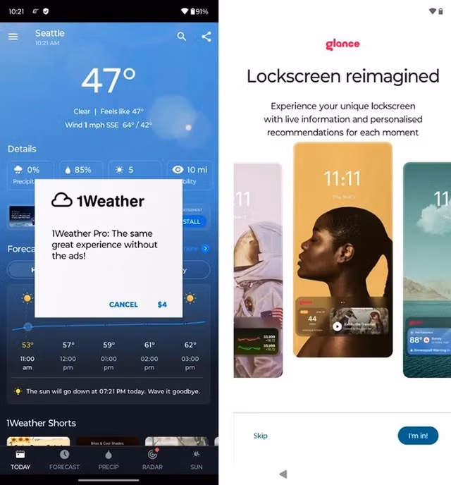Ứng dụng thời tiết 1Weather được cài đặt sẵn chứa đầy quảng cáo và thậm chí nhiều đề xuất ứng dụng hơn. Khi cố gắng xóa quảng cáo, người dùng sẽ được nhắc mua phiên bản chuyên nghiệp với giá 4 USD. Ứng dụng này có lịch sử quyền sở hữu khó hiểu, khiến khó biết chính xác ai là người cấp quyền theo dõi vị trí cho chúng.