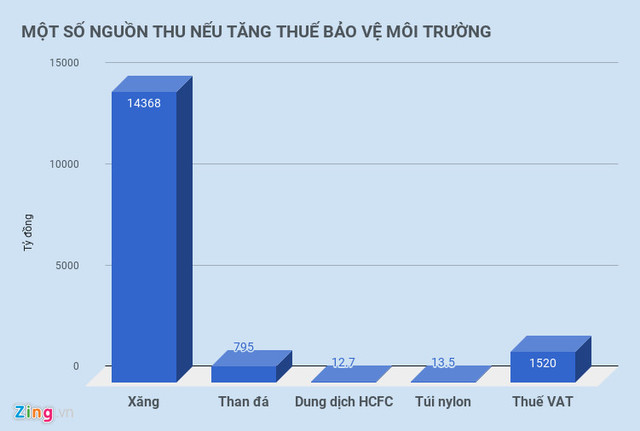 Đối với than đá, khi tăng thuế từ 20.000 đồng/tấn hiện nay lên 30.000 đồng/tấn, thu ngân sách dự kiến tăng thêm 795 tỷ đồng/năm. Với dung dịch HCFC (thường dùng cho điều hòa, máy làm lạnh), ngân sách dự kiến tăng thêm 12,7 tỷ đồng/năm từ việc tăng thuế. Tăng thuế bảo vệ môi trường với túi nylon cũng dự kiến tăng thu 13,5 tỷ đồng/năm.
