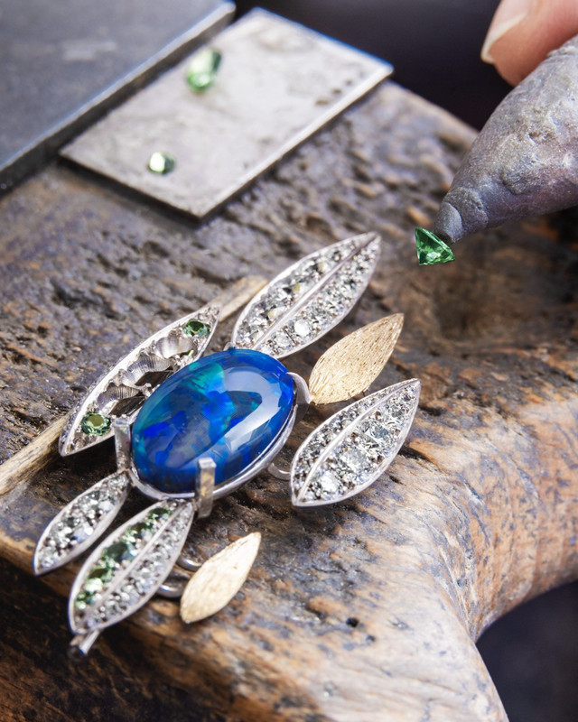 Ánh vàng óng ả được nâng tầm bởi viên ngọc opal đen Úc thượng phẩm, nặng tới 13,19 cara, lấp lánh rực lửa trong bảng màu độc đáo từ lam sáng đến xanh táo, được bổ khuyết bởi những viên đá garnet tsavorite quyến rũ.