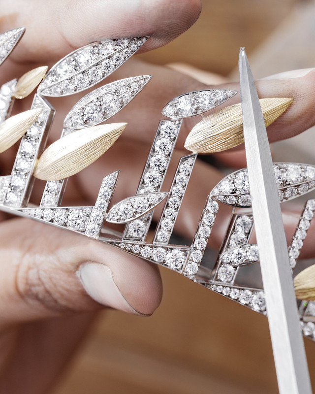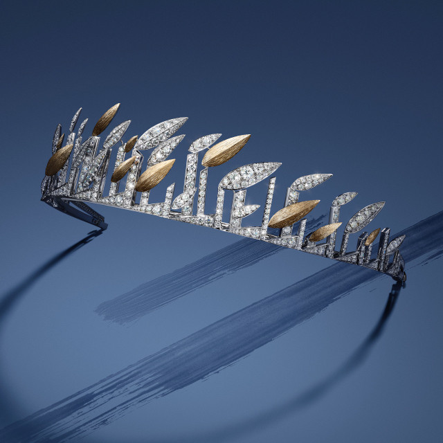 Đại diện cho nét đặc sắc không thể nhầm lẫn của Nhà chế tác, chiếc tiara là nét chấm phá cuối cùng của bộ trang sức. Tính trừu tượng được kết hợp với kỹ thuật kim hoàn vàng xuất sắc trên vòng lá vàng chạm khắc thủ công, dung hoà trang sức với sinh khí của thiên nhiên.