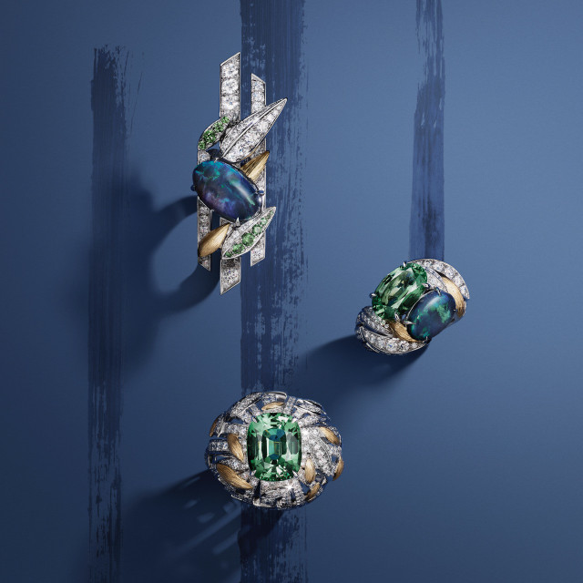 Một viên đá garnet tsavorite giác cắt hình gối nặng 7,24 cara ngự trên chiếc nhẫn đầu tiên. Chiếc thứ hai tái khám phá mô-típ toi et moi theo một cách mới, ở đây sắc độ mãnh liệt của garnet phản chiếu trong opal rực lửa. Với cấu tứ kéo dài nhấn mạnh dáng hình thanh mảnh đặc trưng của bộ trang sức, chiếc nhẫn thứ ba nhẹ nhàng, tinh tế ôm lấy ngón tay.