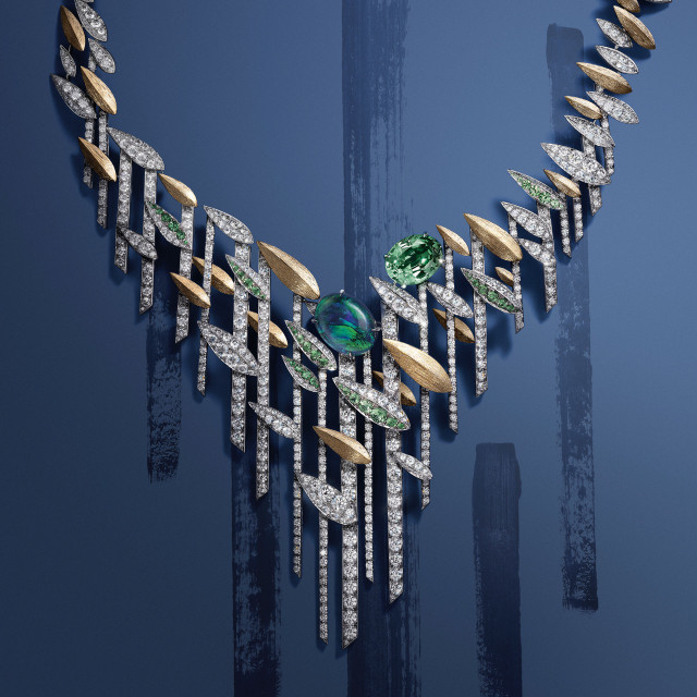 Đem tới cho chiếc cổ điểm nhấn hiện đại, vòng bib này được cấu thành từ những lá và ống tre bắt mắt. Dáng chữ V rủ xuống gợi tưởng đến một số bản vẽ hết sức hiện đại hay các mẫu trang sức từ di sản phong phú của thương hiệu, đại diện cho phong cách Chaumet đặc trưng ghi dấu trên thiết kế này.