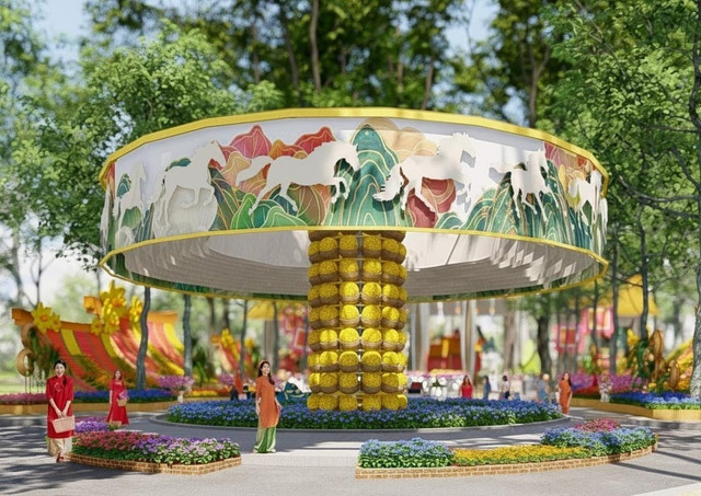 Lấy cảm hứng từ hình tượng Ngựa – linh vật của năm Bính Ngọ 2026, thiết kế tổng thể hội hoa xuân khắc họa hình ảnh ngựa phi nước đại, biểu trưng cho sức mạnh, sự bền bỉ và khát vọng vươn lên. Hình tượng này được thể hiện xuyên suốt các đại cảnh với gam màu chủ đạo đỏ, cam, vàng kết hợp sắc xanh của thiên nhiên, tạo nên tổng thể rực rỡ, giàu năng lượng.