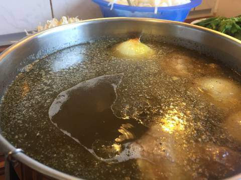 Bước 4: Gắp phần xương đã ninh ra khỏi nồi, lọc lấy nước dùng và chắt thêm vào nồi 2,5l nước lọc, nêm nước mắm và đường cho vừa ăn, tiếp tục đun sôi trên lửa nhỏ.