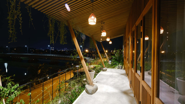 Nơi ăn uống trên tầng, ngắm cảnh vật thay đổi một ngày trên sông, từ bình minh đến khi hoàng hôn và ánh đèn ở đô thị phía xa xa.