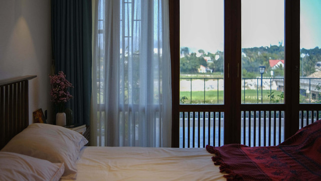 Gian bếp với ô cửa lớn mở ra khoảng trời xanh màu cây lá. Hay những phòng ngủ sau hàng hiên lam gỗ, riêng tư ý nhị qua lớp cửa song lam... Ngôi nhà nép mình bên dòng sông thật đẹp dưới chân ngọn núi mỗi chiều hoàng hôn.
