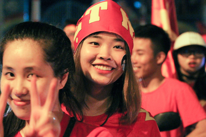 Các trục đường chính của Hà Nội dẫn về Hồ Gươm hay Nhà hát Lớn tắc nghẽn và tràn ngập màu đỏ của lá quốc kì. Sau khi tiếng còi mãn cuộc vang lên, người dân bắt đầu đổ ra đường để ăn mừng chiến tích của đội tuyển Việt Nam.