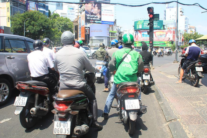 Các bác tài xe ôm công nghệ cũng tranh thủ trú nóng dưới bóng cây