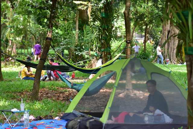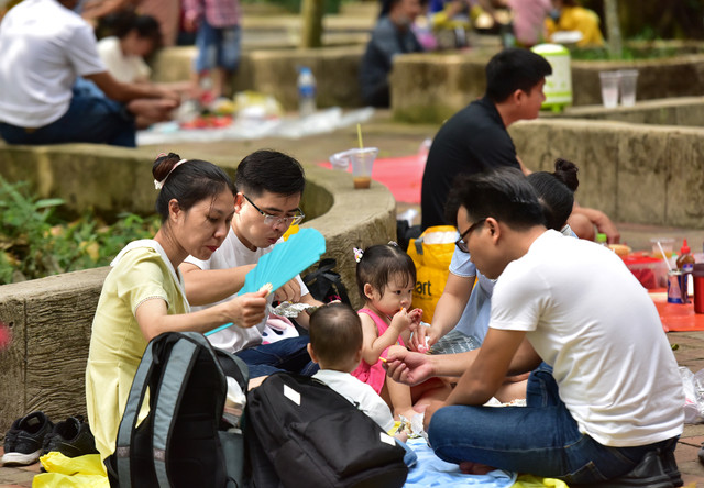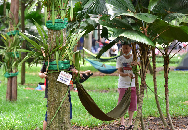 Đây cũng là thời điểm nhiều gia đình, nhóm bạn tìm đến những nơi có bóng mát, bên hồ để trải lều, bạt, mắc võng nghỉ ngơi, ăn uống dã ngoại.