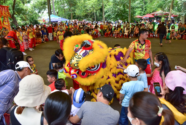 Khu vực sân khấu biểu diễn, đội lân sư rồng khuấy động không khí vui chơi thêm sôi động, thu hút nhiều du khách, nhất là trẻ nhỏ.
