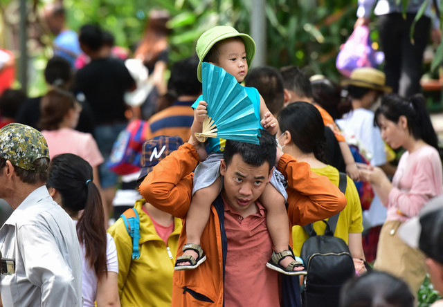 Những gia đình có trẻ nhỏ khá vất vả khi di chuyển giữa dòng người đông đúc. Nhiều trẻ được người lớn bế, cõng để di chuyển tham quan các khu vực.