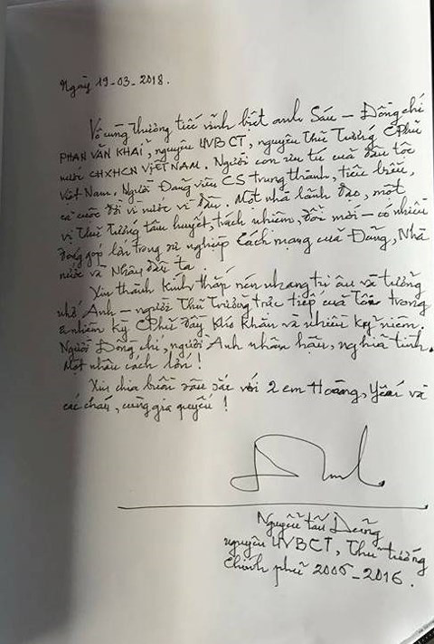 Nguyên Thủ tướng Nguyễn Tấn Dũng chia sẻ cảm xúc trong sổ tang: "Xin thành kính thắp nén nhang tri ân và tưởng nhớ anh - người thủ trưởng trực tiếp của tôi trong nhiệm kỳ Chính phủ đầy khó khăn và nhiều kỷ niệm. Người Đồng chí, người Anh nhân hậu nghĩa tình. Một nhân cách lớn".