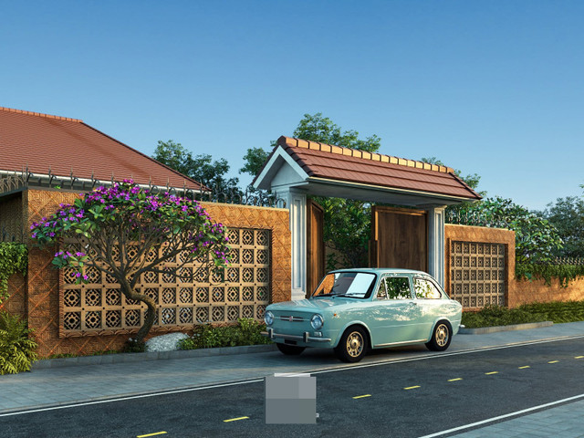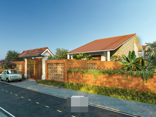 Ngoại cảnh và mặt tiền ngôi nhà cấp 4 mang đặc trưng phong cách kiến trúc Việt Nam.