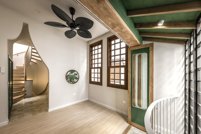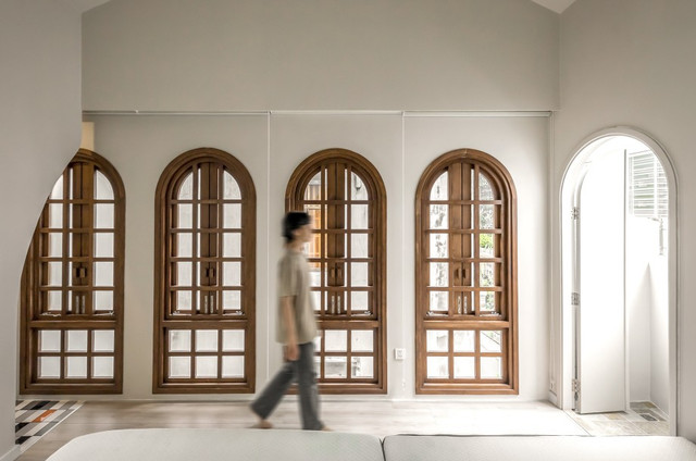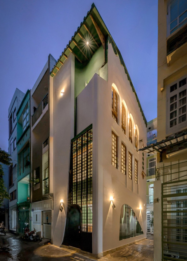 Để tận dụng tối đa nguồn ánh sáng tự nhiên, KTS đã đưa ra giải pháp đột phá trong thiết kế mặt tiền ngôi nhà ống 3 tầng. Trong đó, một nửa mặt tiền được khoét thành hệ cửa vòm kết hợp sử dụng hệ lam chắn. Song song với đó, bên hông nhà KTS còn thiết kế 8 cửa sổ giúp tối ưu nguồn sáng.