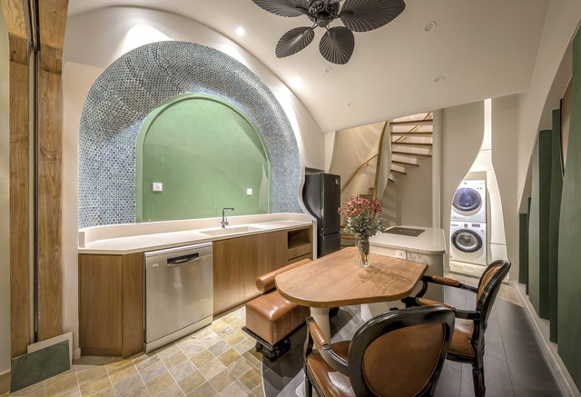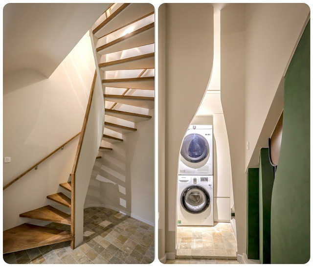 Để tận dụng diện tích, khoảng lùi dưới chân cầu thang được sử dụng làm nơi giặt và sấy quần áo rất gọn gàng.