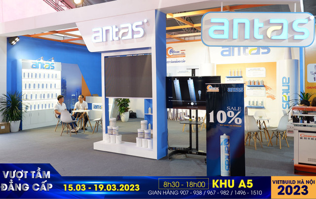 Gian hàng keo Silicone Antas với cách bày trí bắt mắt, nhiều màu sắc cùng các sản phẩm mới mang đến nhiều tính năng trám bít, ứng dụng đa năng trong nhiều lĩnh vực.
