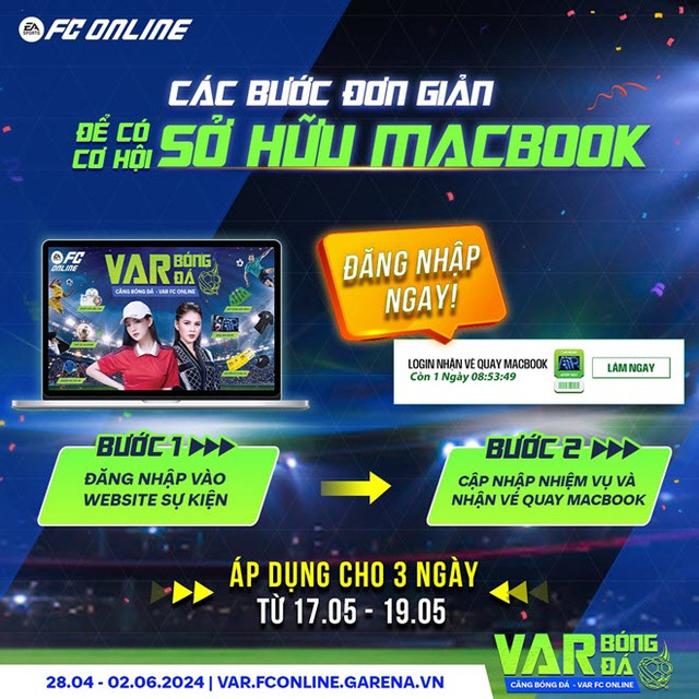 Đặc biệt, chỉ riêng cuối tuần này, nhằm tri ân người xem đã yêu mến VAR Show, FC Online dành tặng riêng anh em 03 vé quay Macbook Air miễn phí khi đăng nhập trang website https://var.fconline.garena.vn mỗi ngày từ 17/05 đến 18/05.