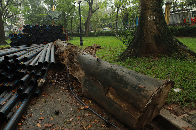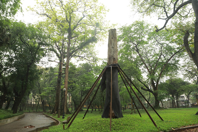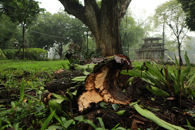 Công ty TNHH một thành viên Công viên cây xanh Hà Nội đã tỉa cành để tránh rơi vào người dân. Hiện vẫn còn sót lại một số cành mục rơi xuống quanh gốc.